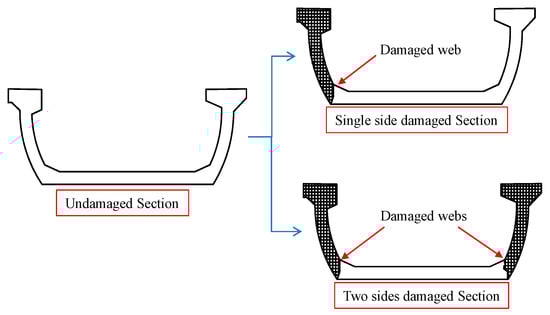 Figure 20 gives the undamaged girder section turned into damaged section by single side and two sides impact action. It was illustrated clearly that the original U section was weakened to the combination of bottom slab and only one side web after single side lateral collision. While for the two sides collision, the U section was crippled as the bottom slab section only, consequently the bearing capacity decreased more seriously than the single side damage. In addition, the decrease of the structural bearing capacity was also related to the damaged region or section. As previously discussed, web damage at the beam end will induce less reduction on the bearing capacity than damage around middle span.