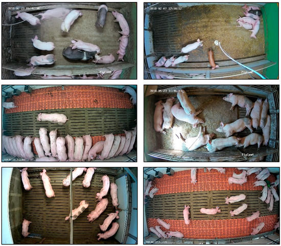 The images used in this study were recorded by top view cameras (VIVOTEK IB836BA-HF3, and Hikvision DS-2CD2142FWD-I). The cameras were connected via cables to servers and video images from the cameras were recorded simultaneously and stored on hard disks. Recording in different farming conditions allowed for capture of images with pigs of different skin colour and age, housed under various floor type and illumination conditions, which facilitated the development of a robust deep learning model. Examples of images used for development of the detection model are illustrated in Figure 1.
