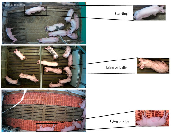 According to the findings of Nasirahmadi et al. [12], when in a side (lateral) lying posture pigs lie in a fully recumbent position with limbs extended, and when in a belly (sternal) lying posture the limbs are folded under the body. Due to the lack of available benchmark datasets for pigs’ lying and standing postures, three classes of standing, lying on belly and lying on side were defined in this work. Examples of these postures are represented in Figure 2. Most of the possible scenarios of individual pig standing and lying postures within the group have been considered. The proposed detection methods were developed and implemented in python 3.6 and OpenCV 3.4 using TensorFlow [20]. Experiments and the deep learning training were conducted on a Windows 10 with a NVIDIA GeForce GTX 1060 GPU with 6GB of memory.