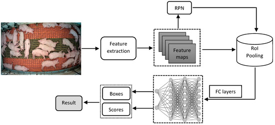The Faster R-CNN method [27] was used to monitor standing, side and belly lying postures of pigs. Figure 3 shows the architecture and different steps of the Faster R-CNN utilized in posture detection. Various feature extraction methods (Inception V2, ResNet50, ResNet101 and Inception-ResNet V2) were applied and the regional proposal network (RPN), which is a fully convolutional network for generating object proposals, was used to produce a proposed region for each image and generate feature maps in the final layer by predicting the classes [25]. The feature maps were fed into the region of interest (RoI) pooling to extract regions from the last feature maps. Each RoI (region of pigs) was then determined to a confidence score. Finally, the feature vector from the RoI was fed into several fully connected (FC) layers of a softmax classifier to obtain the final assurance scores and a regression bounding box to localize the coordinates of the detected objects.
