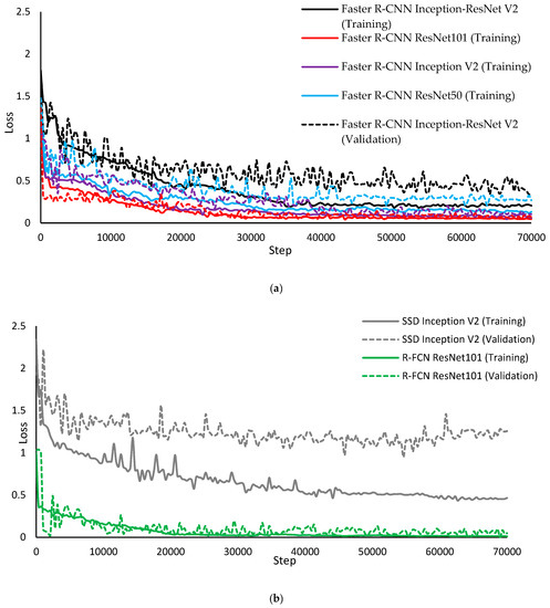 Figure 6. Training and validation loss during the (a) Faster R-CNN, (b) R-FCN and SSD training processes.