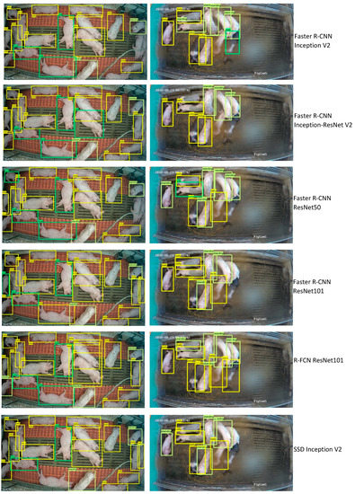 Furthermore, in this study testing time of the state-of-the-art detection models was calculated. The speed of each proposed method was measured based on the frames per second (FPS) [35]. The results show a FPS of 6.4 for the Faster R-CNN Inception V2, 3.6 for the Faster R-CNN ResNet50, 3.8 for the Faster R-CNN ResNet101, 2.3 for the Faster R-CNN Inception-ResNet V2, 5 for the R-FCN ResNet101, and 8.8 for the proposed SSD Inception V2. According to Table 2, R-FCN ResNet101 showed the highest performance as well as an acceptable FPS (5) for the pig posture detection. It was also found that the Faster R-CNN Inception V2 had high enough performance for lying-on-side posture detection along with a FPS of 6.4. Since the lying posture can be used as a parameter of pig comfort assessment in various thermal conditions, the Faster R-CNN Inception V2 model can be beneficial in terms of higher processing speed. The SSD model had the highest rate of FPS (8.8), however the lowest performance was obtained in this model, which was not sufficiently reliable in pig lying and standing detection.