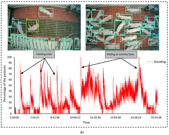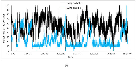 Figure 9. (a) Results of scoring (in percentage) of the lying and standing postures across the day. (b) Standing posture (light blue rectangle), lying on belly (blue rectangle) and side posture (green rectangle).