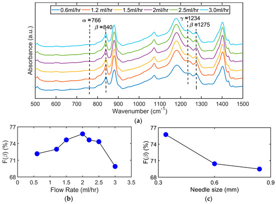 where F(β) represents the fraction of β-phase in the sample; Aα and Aβ correspond to the absorbance values at 766 and 840 cm−1 and Kα and Kβ are the absorption coefficients at 766 and 840 cm−1. The absorption coefficients values were given as 6.1 × 104 and 7.7 × 104 respectively [59]. The corresponding percentage of β-phase for different flow rates and needle size are shown in Figure 3b,c, respectively.