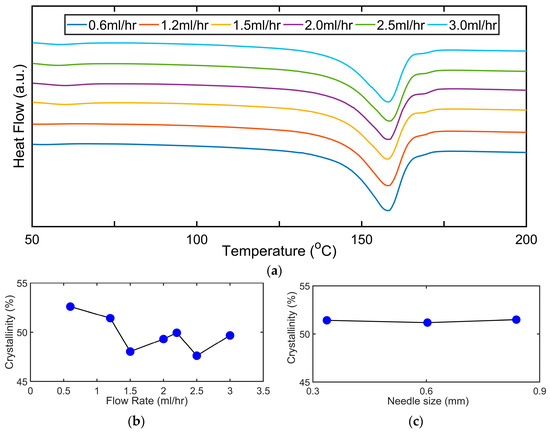 DSC characterization of various samples made with different flow rates and needle sizes: (a) the DSC thermograms for nanofibers obtained from different flow rate for the electrospinning process, the melting point was approximately around 158 °C for the nanofiber samples; (b) the variation of the crystallinity for different flow rates; (c) the variation of the crystallinity for different needle sizes employed for electrospinning.