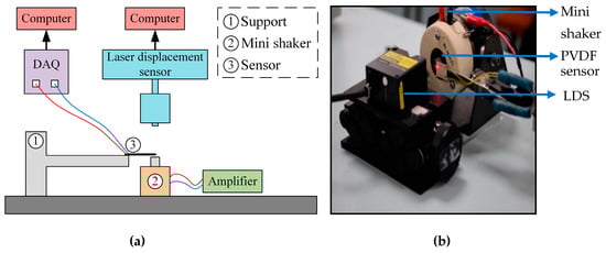 The sensor is first subjected to several frequencies in the cantilever configuration and tested against a commercial laser displacement sensor (LDS) system to characterize its vibration response. The schematic of the experimental set-up is shown in Figure 5a and a digital photograph is shown in Figure 5b. The sensor is fixed at one end to a rigid support and the other end is free, hence resulting in a cantilever configuration. A mini shaker connected to an amplifier and frequency generator is used to test the sensor for different frequencies and amplitudes of the displacement. The vibration of the mini shaker results in displacement of the free end of the sensor, hence generating corresponding strain in the PVDF nanofibers. The (LDS) is used to measure the tip displacement of the free end of the cantilever sensor. The voltage output from the sensor is measured by an analog input data acquisition system (DAQ). The laser displacement sensor and the DAQ are connected to computer systems to enable the timestamps.
