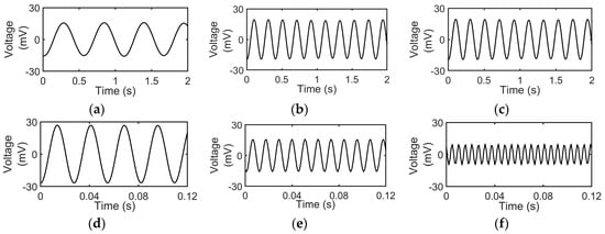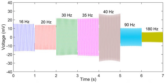 The results of vibrating the sensor with six different frequencies are shown in Figure 6a–f. Each test is repeated three times or more. The frequency range is chosen such that it lies within the vibrational natural frequency experienced by the racket string after being impacted by a ball [66] or during the playing of a guitar which is at around 200 Hz [67]. The frequency generator produced a sinusoidal signal that drives the mini shaker. The voltage output from the PVDF sensor is a sinusoidal wave as can be seen from Figure 6a–f. It can be seen that the output of the sensor increases with frequency for Figure 6a–d which correspond to the frequency values of 2, 5, 10 and 40 Hz, respectively. This increase in the voltage output with the frequency is attributed to the increase in strain rate. The higher frequency of the mini shaker results in the reduction of the time taken between two subsequent stretch and release cycles of the cantilever than at a lower frequency. This means that the same amount of strain is applied to the sensor in a lesser amount of time and hence generates a higher strain rate. Thus, it can be deduced that the voltage output is also influenced by strain rate beside strain. This increase in the voltage output of the sensor with the strain rate in PVDF nanofibers has been reported previously [68,69]. The amplitude of the mini shaker vibrations is tried to be maintained at a constant value for all the frequency tests. However, after a frequency of 40 Hz, the amplitude of the mini shaker starts to decrease sharply. This is because the power of the mini shaker is proportional to its frequency and amplitude. After a frequency of 40 Hz, the mini shaker is not able to provide the required amplitude of displacement even at the highest displacement setting. Hence, it can be seen in Figure 6e,f that the voltage output has decreased as compared to other frequencies. This is due to reduced displacement and hence a reduction in strain in the PVDF nanofibers.