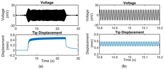 Voltage output from the sensor plotted against the tip displacement of the cantilever on the same scale for a frequency of 90 Hz: (a) Voltage output from the sensor against the tip displacement for a total testing duration of 30 s where the mini shaker is on between 5 and 25 s; (b) A zoomed in version of the voltage and tip displacement plot which shows the waveforms of the strain input and the corresponding voltage output of the sensor.