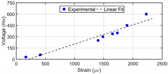 The results from the tests are shown in Figure 8. The plot shows a linear relationship between the voltage output and the applied strain due to the tip displacement provided to the sensor in the cantilever configuration. The sensitivity of the sensor to strain inputs was calculated to be 0.2 mV/με for the range of strain between 200 to 2300 με.