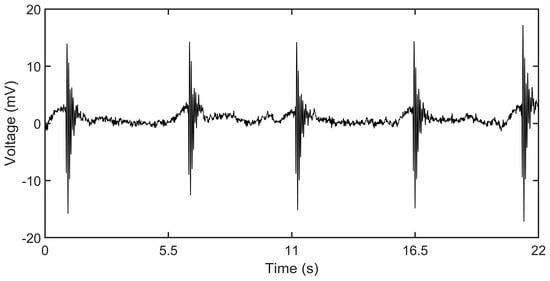 An impact hammer test is first done to examine the performance of the sensor on a single impact force subjected to the string. The string is struck at the center with a light hammer constituting of a flat tip at intervals of around 5 s. The output of 5 such hits with the hammer is shown in Figure 10. The peak to peak output voltages vary between 25–35 mV and the output shows a repeatable voltage profile. The hammer impact on the string generates a very short cycle of stretch and release, causing the string to vibrate which produces the corresponding voltage output profile generated by the piezoelectric PVDF nanofiber sensor. The vibration quickly reduces to zero due to the damping produced by the clamping of the string to the fixed iron C-clamps.