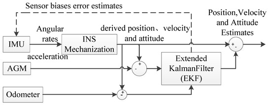 where white noise of position, velocity, and angle for IMU. The estimation error of EKF is the latest time estimate of the system state vector, and the filter works in a closed loop with an error feedback correction. Therefore, the system error state vector completes the observation update, it is used to correct the navigation state and parameters and reset the error state vector to zero. The state updating equation is expressed in the discrete form as follows:
