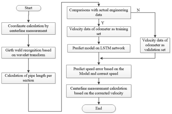 The odometer may slip at the girth weld when the pipeline centerline measurement system travels along the pipeline, thus resulting in inaccurate velocity information. As the velocity information at the slip of the girth weld cannot be used for correction, it is necessary to identify and estimate the velocity error that cannot work normally. According to the velocity error of the odometer when it works normally, the method-based AI can be used to build the model to predict the velocity error when it works abnormally. The specific flow chart is shown in Figure 4. Firstly, the geographic coordinates of the pipeline centerline are obtained through centerline calculation using the IMU, AGM, and odometer. Secondly, it is necessary to identify the girth weld with acceleration based on the wavelet transform, and to identify the measured length of each pipe and bend according to the girth weld. Then the length is compared with the engineering data. If they are consistent, the odometer velocity is regarded as the training set, and if not, the odometer velocity is required to be predicted and corrected. Finally, the velocity error when the odometer slips can be corrected, and the corrected velocity can be used for coordinate calculation and centerline measurement.