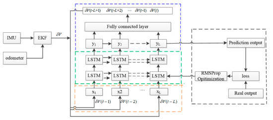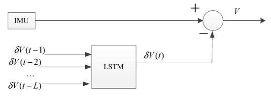 With the velocity errors of the past moments as the input and the velocity error information of the current time as the output, a model is developed using an LSTM network when the odometer slips. The overall framework of the network model and the training process are shown in Figure 6. and are the velocity and velocity errors, respectively. is the velocity error at the current time, are the past velocity errors.