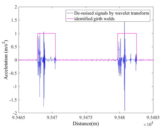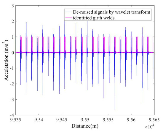 The output data of the accelerometer when the in-line inspection tool runs in the pipeline and the de-noised signals through the WT are shown in Figure 9. The de-noised accelerometer signals can be effectively used for the identification of the girth weld of the pipeline, and the result obtained is shown in Figure 10 and Figure 11. In order to ensure the correctness of the identification, the distance and time of the odometer passing through the girth weld were reviewed. As shown in Figure 11, the axial distance of the pink square is the length of the PIG. After measuring, the length was equal to the actual length of the PIG, which proves the validity and accuracy of the method. Therefore, each weld information can be identified by the acceleration signal after wavelet de-noising. With the collected IMU data, the multi-sensor data fusion calculation was carried out and the centerline ordinates were obtained. According to the centerline ordinates and the identified girth welds, the pipe length of each section can be calculated, and compared with the actual engineering data.