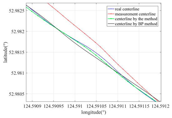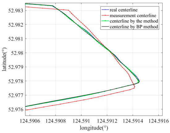 In order to verify the effectiveness of the proposed method, a method in which a BP neural network was used to replace the LSTM network (BP method) was implemented, and the results of the method were compared with the results of the used BP method. In the BP method, a BP neural network with a three-layer structure was used, and the activation functions were sigmoid. Figure 14 and Figure 15 show the comparison results between the results of the different algorithms; the measurement centerline, real trajectory, centerline corrected by the proposed method, and centerline corrected by the BP method are indicated by the red, blue, green, and black curves, respectively. As shown in Figure 15, the corrected centerline obtained by the proposed method is close to the real trajectories, and the corrected centerline obtained by BP method exhibits larger deviation from the real centerline. Table 3 shows the errors between the measured centerline obtained on using different methods and the actual centerline at some points when the odometer slips. Error 1, Error 2, and Error 3 represent the error between corrected centerline by the proposed method and the real centerlines at some points, the error between corrected centerlines by the BP method and the real centerline at some points, and the error between measured centerlines and real centerlines at some points, respectively. From Figure 15 and Table 3, it can be clearly observed that the performance of the proposed method is superior to the BP method.
