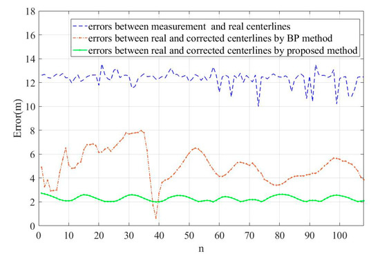 Table 4 shows the mean of the absolute position error (MAE) results obtained for different algorithms. The error between measured and real centerlines was 8.75 m, and the error between real and corrected centerlines by the BP method was 4.84 m. Based on the calculations, it can be observed that the mean of absolute position errors between real and corrected centerlines by the proposed method was 2.02 m, which is less than the error between real and corrected centerlines by the BP method, this is a reduction of approximately 58%. Therefore, it can be concluded that the proposed method can provide a better performance in terms of positioning accuracy.