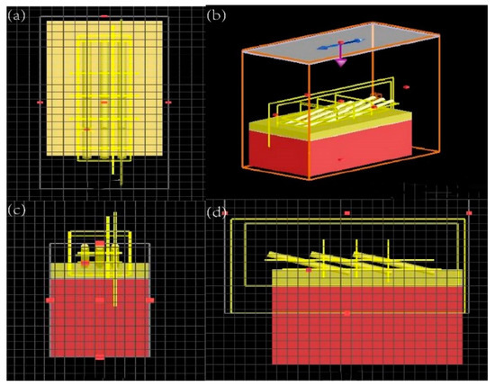 Models of Au nanorods (AuNRs) for finite-difference time-domain (FDTD) simulation: (a) XY plane, (b) oblique view, (c) XZ plane, (d) YZ plane.