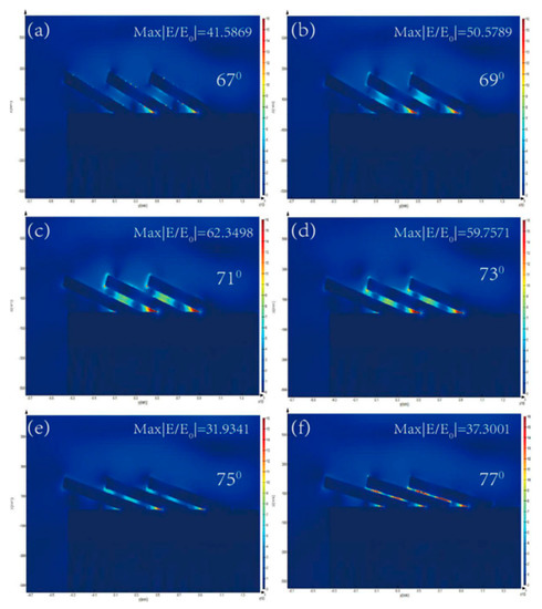Calculation results of the AuNRs array with different tilting angles by the FDTD method: (a) β = 67°; (b) β = 69°; (c) β = 71°; (d) β = 73°; (e) β = 75°; (f) β = 77°.
