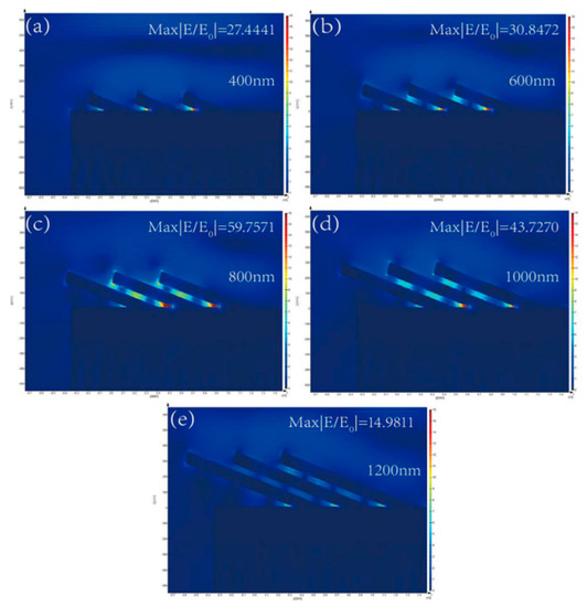 Calculation results of the AuNRs array with different lengths by the FDTD method: (a) L = 400 nm; (b) L = 600 nm; (c) L = 800 nm; (d) L = 1000 nm; (e) L = 1200 nm.