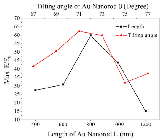 In order to demonstrate the effect of the tilting angle and length of the AuNRs, the distributions of the electromechanical field were visualized by the FDTD calculation. The model and simulation parameters are described in Section 2.3. The results of the calculation were shown in Figure 3 and Figure 4.