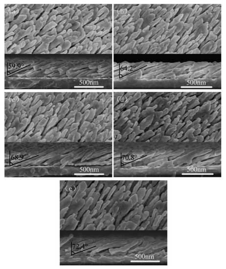 The SEM images of AuNRs deposited at different deposition angle θ: (a) θ = 80°, (b) θ = 82°, (c) θ = 84°, (d) θ = 86°, (e) θ = 88°. The upper part of each image is the top-view and the lower part is the cross-section view.