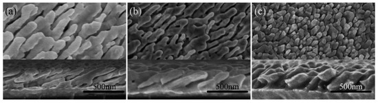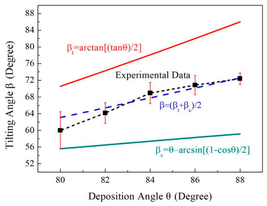 Figure 2b shows the schematic of the fabricated AuNRs. The definition of the deposition angle θ and the tilting angle of AuNRs, β, are given. The principle of OAD is the shadowing effect during evaporation [66]. As shown in Figure 2b, β is always smaller than θ. The growth dynamics will determine the relationship between β and θ. This is also one of the important topics which this paper will talk about in detail.