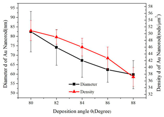 The plot of Au nanorod diameter and density vs. the deposition angle θ.