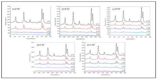 Figure 10 shows the average SERS spectra of BPE detected on the AuNRs array substrates deposited at θ = 80°, 82°, 84°, 86° and 88°, respectively. All the SERS spectra show three characteristic peaks of BPE [69] listed in Table 2: (C=C stretching mode), (aromatic ring stretching mode) and (in-plane ring mode). Among the five substrates shown in Figure 6, the best LOD, 10−9 M, can be obtained for the nanostructures fabricated at deposition angle.