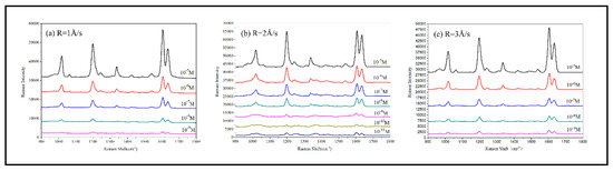 SERS spectra of BPE detected on the AuNRs substrates fabricated with different deposition rate: (a) R = 1 Å/s; (b) R = 2 Å/s; (c) R = 3 Å/s.