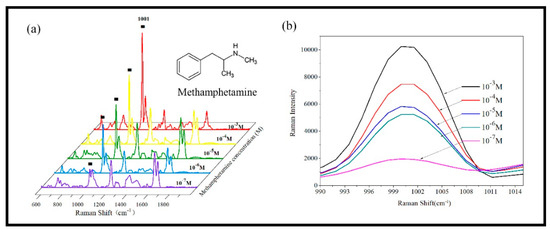 To apply the SERS technology into a real-life area is a mission that lots of researchers have made great efforts to accomplish. Amphetamines, represented by methamphetamine, are the most widely used synthetic drugs. The yield and consumption increase year by year. This kind of drug has brought great harm to society, triggered various illegal and criminal activities, which have seriously disturbed public security. The rapid detection of drugs is of great significance for combating crime and suppressing the epidemic of drugs. At present, common methamphetamine detection methods include gas chromatography [61], high-performance liquid chromatography [62], gas chromatography-mass spectrometry [63], enzyme-linked immunosorbent assay [64], and the immunocolloid gold technique [65]. Among them, the first few methods have higher requirements for analysts and equipment, and they are not suitable for on-site testing. The latter two methods require expensive reagents. The LOD of the commercial colloidal gold test paper is 6.7 × 10−6 M. Sometimes false positive signals may be given. There is an urgent need for a reliable on-site rapid detection technology for amphetamines. SERS is a highly sensitive sensing technology with a single molecule “fingerprint” identification capability. With the development of portable Raman spectroscopy, SERS technology can play an important role in the field of drug detection.