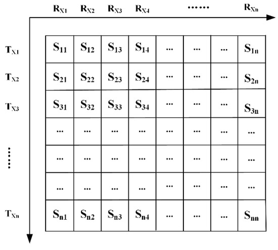 The symbols, n, RX, and TX, denote the total number of the array elements, transmitters, and receivers, respectively. For example, when TX1 is served as an excitation array element and all the array elements including TX1 are served as receivers, it generates n signals labeled as S11, S12, S13, …, S1n. Then, the remaining array elements are sequentially excited. Finally, n2 response signals in total are generated. In this full matrix, the main diagonal signals are the self-transmitting and self-receiving signals from each array element. The whole procedure is similar to a B-scan in a ground-penetrating radar.