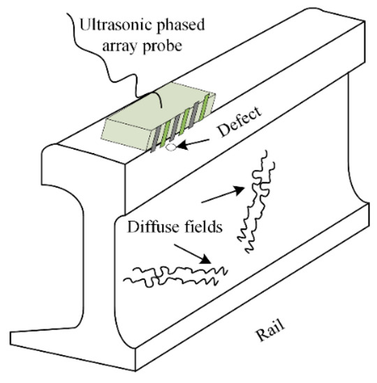 The methods of extracting the Green’s function are different in a conventional active and passive approach. The former uses a transmitting–receiving mode composed of a transmitter and a receiver to evaluate the Green’s function, while the latter only utilizes receivers to record ambient noise or diffuse field information. Ultrasonic phased array technology is analogous to the active approach. As mentioned above, the array elements are linearly distributed, which also leads to the nonuniform diffuse fields in the tested structure. However, fortunately, this does not weaken the theoretical basis for extracting the Green’s responses by using the diffuse fields. The schematic diagram of rail inspection is shown in Figure 2 with the phased array probe.