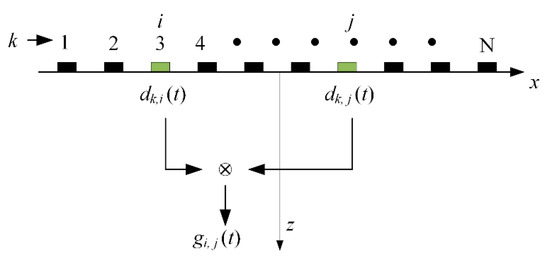 In our experiments, the phased array was combined with the diffuse fields to extract the Green’s function, as shown in Figure 3. The Multi2000 system (M2M-NDT Co. Ltd., Les Ulis, France) was used to set and select the appropriate time-windowed signals in the diffuse fields. The starting time of the window is late enough, and the length of the window is large enough. With the characteristics of random noise fluctuation, the diffuse field is distributed throughout the rail. In this case, the full matrix, , can be obtained, which satisfies the characteristics of the diffuse fields, named as the diffuse full matrix. When the kth element is excited, the signals, and , are acquired from the ith and jth receivers. Consequently, the cross-correlation, , between these receiving elements is: