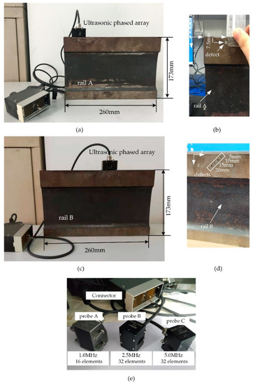 Experiments were performed on rails, as shown in Figure 4a–d (corresponding to rails A and B). The height and length of the rails was 173 and 260 mm, respectively. A 5-mm diameter hole was drilled in rail A. The hole center was 7.5 mm to the surface of rail. Four holes with 2 mm in diameter were drilled and distributed on different depths labelled on rail B. In our experiment, the longitudinal wave velocity was 5900 m/s. Different ultrasonic phased array probes were used to investigate the imaging effects of the near-surface defects in rails as detailed in Figure 4e and Table 1. Unlike the case of guided waves [31], ultrasonic longitudinal waves in rail propagate along the z-axis direction. As long as the length of rails is much larger than that of transducer, the size of the rails does not affect the results. Additionally, according to the near field formula [32], , where D is the transducer aperture and is the wavelength. Therefore, the defects are located in the near field because the distances of the defects from the rail surface (7.5 and 20 mm farthest from the surface) are less than of probe A, B, and C, which is about 42.85, 107.80, and 215.60 mm, respectively.