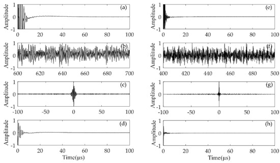 (a–d) are normalized signals for i = j = 8 corresponding to the full matrix, , , , and with a 1.0 MHz excitation frequency and 16 elements. (e–h) are normalized signals for i = j = 16 corresponding to the full matrix, , , , and with a 2.5 MHz excitation frequency and 32 elements.