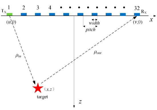 The full matrix wavenumber algorithm was applied to the ultrasonic field data. The 2-D geometry of ultrasonic phased array is displayed in Figure 6. In this figure, X and Z denote the lateral and depth directions. The scatterer is denoted by a star. The element width and adjacent elements spacing is represented by width and pitch, respectively, as shown in Figure 6. The coordinates of the transmitter and receiver are and respectively, so the distances from the target to the transmitter and receiver are and .