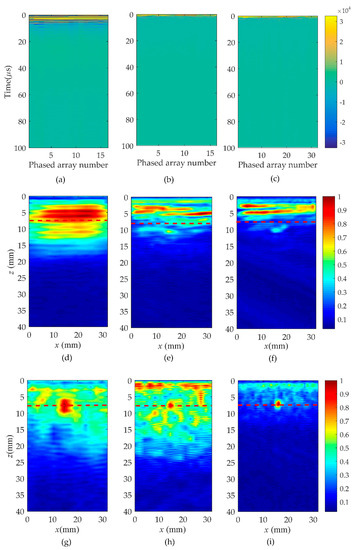 As analyzed in the previous section, the nonlinear saturation effect of the phased array probe makes the defect information in the early time, completely submerged under the condition of strong noise. The near-surface defects cannot be reconstructed directly from the full matrix, , which is directly obtained and named as the direct full matrix. Here, the symbols, i and j, correspond to a pair of transmitting and receiving elements’ number.