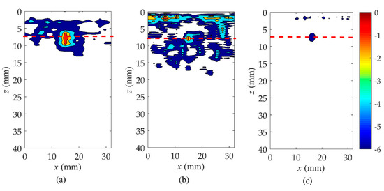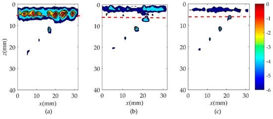In order to further analyze the near-surface reconstruction of rail in these three cases, the results of the point spread function are presented. The point spread function is greater than–6 dB down from its maximum value, which is a common approach for expressing the imaging performance of an array [35]. According to the results of the three cases as shown in Figure 9 and Figure 10, the value of the point spread function in case three is the smallest and closest to the actual size. It is noticed that case one presented the worst imaging effect in all three cases, and the defect that is closest to the surface of rail B was still submerged by the noise. A higher excitation frequency and a greater number of elements could be attributed to a better defect image.