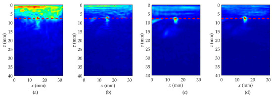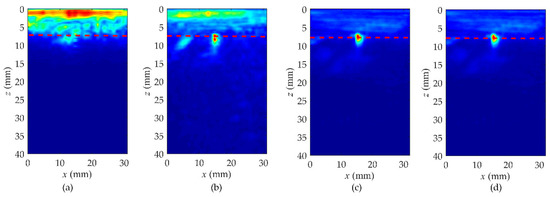 As listed in Table 3, T was set as a variable and the other parameters remained constant to study the quality of the hybrid full matrix. Four different values of T were selected, with 40, 80, 140, and 160 μs. The imaging results are shown in Figure 11, and the position of the defect is also marked by the red dashed line. We can observe that the defect is mixed with the near-surface noise when T is equal to 40 μs. Although the defect can be roughly identified while T is equal to 80 μs, its shape is irregular. With the increase of T, the quality of the hybrid full matrix gets better and the imaging resolution is improved. When T reaches 140 μs, the near-surface noise is fully suppressed, and the shape and position of defect are all in accordance with the actual shape.