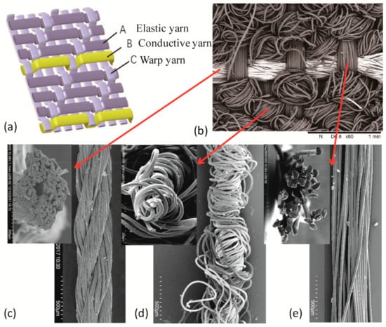 Stretchable woven FCB. (a) Structure of FCB; (b–e) SEM images of the woven FCB (b), conductive yarn (c), elastic yarn (d), and warp yarn (e).