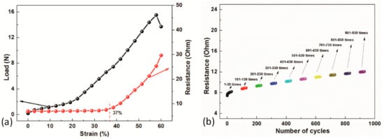 In reference to potential applications of the FCB for wearable devices and an average maximum elongation of 20~30% of the human skins, the woven FCB was then further cyclically stretched between 0~30% strain for as many as 1000 cycles. Strain rate was the same as previous test, set as 400 mm/min to simulate stretching of FCB induced by normal tension induced by human movements. The electrical resistance of the FCB changed from initial 8 Ω to about 11 Ω finally, as seen in Figure 3b, demonstrating a satisfactory stability of electrical resistance especially when incorporating high resistance components (>1000 Ω) or in low-accuracy applications.