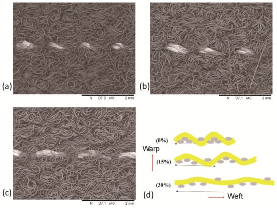To reveal the underlying mechanism that contributes to the above mechanical deformability with electrical integrity, structure morphologies of the crimped conductive tracks in the soft-woven FCB during the tensile test were examined. Morphological observation of the resultant sample was conducted on a scanning electron microscope (SEM). Figure 4a–c shows the obtained SEM images of several representative geometrical configurations of the FCB while stretched in transverse direction. During the process of stretching in transverse direction, conductive tracks were straightened and accommodated the applied tension while being straightened, with an increased period and decreased amplitude for the wavy curves, as shown in Figure 4d. At 30% strain, the yarns of conductive tracks became more dense and began to undertake tension partly, which is in accordance with the obtained 37% limit strain for stability of electrical resistance as identified above.