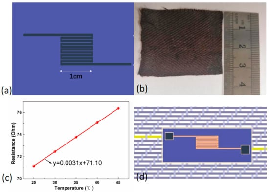 (a) Schematic diagram of the fabric temperature sensor; (b) Picture of the fabric temperature sensor; (c) Typical resistance– temperature curve of the fabric sensor; and (d) Schematic diagram of the permanent connection between the conductive track in the FCB and the sensor electrode.