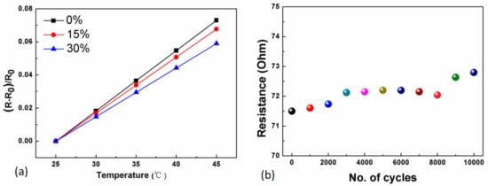 Performance of the whole assembly consisting of fabric temperature sensors connected to FCB. (a) Resistance-temperature relation of the fabric temperature sensor connected to the FCB; (b) Resistance of the fabric temperature sensor connected to FCB in cyclic stretching processes at 30% strain.