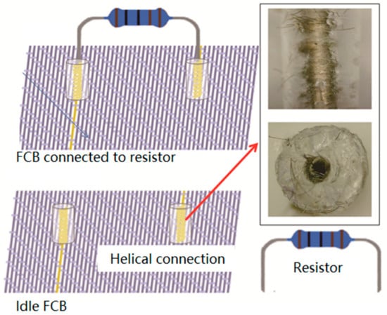 As mentioned above, next-to-skin wearable applications based on textiles consistently demand the capability of washing or re-use. Because the reported design of FCB has demonstrated excellent washing capability over 30 times [], a solution of detachable connection (with connector holes for electrodes) is proposed and realized to avoid damage of the conventional electronic components. To enlarge the applications of woven FCB into wearable applications with flexible or rigid electronic components, a solution of detachable connection for electronic components is proposed, with which the external electronic elements can be easily and firmly connected into the flexible circuit electrically as well as removed from the flexible circuit through insert-connectors. As illustrated in Figure 7, the electrodes of the resistors (used as a demonstration of an external electronic component) could be inserted into the connector holes of the woven FCB, by which electronic components are introduced into and motivated by the circuit. When needed, electrodes can be withdrawn from the connector holes to stop working. Most importantly, the connection of electrodes and connector holes were designed to support cyclic reuse. To realize such detachable connection setup, conductive yarn was firstly wrapped around a solid stainless steel needle with a diameter of 800 μm, the same size as that of the resistor electrodes, forming a circular helix (with outer diameter of 3 mm, inner diameter of 800 μm and height of 6 mm). The circular helix was subsequently embedded into a liquid PDMS substrate, and was then cured as a whole at 100 °C for one hour. The solid needle was pulled out after conditioning, forming the connector holes for the electrodes of externally electronic components to be inserted into, which makes the connection detachable.