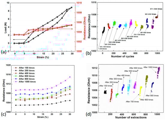 By applying the detachable connection, external components such as sensors or actuators could be pulled out from the connection holes before washing for protection. Hence, the effect of the insert–extraction times on the total resistance of the whole assembly should be studied. Figure 8c presents demonstrates that the total resistance of the FCB generally increased slowly with times of insert-extraction while being stretched within 0~30% strain. Increase of contact resistance is shown as no more than 7% after 1000 times of insert–extraction practice. Figure 8d illustrates a similar trend of increment of resistance with times of insert–extraction at fixed strain. The electrical resistance generally remained constant, implying that the resistor had an intimate and firm contact with the conductive track of the woven FCB samples during stretching. The minor overall increase in total resistance shall be addressed by the increment of contact resistance, which is believed to have been caused by diminished contact between connector holes and electrodes; the contact area between connector holes and electrodes was considerably smaller after times of insert–extraction. When connected with multimeter, there was an trend of ascending resistance of FCB; in contrast, when the FCB was not connected to multimeter, the resistance fell back to a lower value before being measured by multimeter again, revealing a ‘resistance regeneration’ phenomenon. In consideration of the setup of the test, we believe that the heat generated by contact resistance during insertion–extractions (more than by friction) provides a transient boost on the resistance of connections. Notably, when the multimeter was not used and the whole circuit was not powered on, even though the insertion–extraction continued, no heat was generated by contact resistance and the contact resistance decreased as heat slowly dissipated. Luckily, this ‘resistance regeneration’ will not affect applications of FCB since rapid insertion–extraction are not likely to occur in normal use. Such detachable design of the connections in the soft FCB assemblies can boost an increased and wider potential applications of electronic components based on various materials and technologies for multiple purposes.