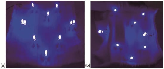 The created FCB assembly consisting of LEDs in the FCB substrate. (a) LEDs are illuminated at 0% strain; (b) LEDs remain illuminated at near 30% strain.