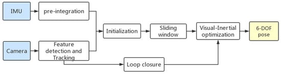 Meanwhile, with the deepening of research and the improvement of computer performance, optimization-based methods have commonly been used in visual-inertial SLAM systems to ensure higher accuracy. A full smoothing method [17] for estimating the entire state history is described by solving a substantial nonlinear optimization problem. Although the outlook is promising, its computational complexity is high, and its real-time performance will gradually decrease as the map grows. Recently, the work proposed in [14] applied a keyframe-based approach to fuse visual-inertial measurements. The use of a sliding window and marginal technology [14,15] ensures the real-time operation of the system, and it has achieved remarkable success. Additionally, the IMU pre-integration technique proposed in [18] can avoid the repeated calculation of the integral when the linearization point changes. Mur-Artal et al. [15] suggested a VI-SLAM system based on their original ORB-SLAM, which originated from the pre-integration ideas of Forster [18]. Qin et al. [19] demonstrated a new Visual-Inertial System (VINS) which is also a complete VI-SLAM system based on tight coupling and nonlinear optimization. The initialization process is robust to unknown states and has excellent application potentials in the field of UAV navigation control.