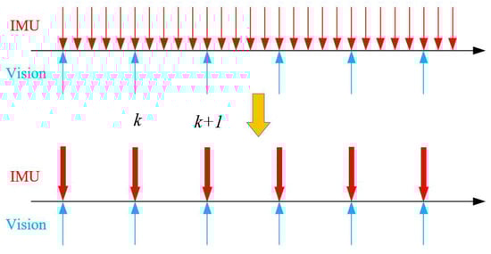 As shown in Figure 2, the measurement rate of IMU is much faster than that of the visual camera. To simultaneously optimize the constraints of vision and IMU in a single framework, it is necessary to integrate the measurements of many IMUs between two adjacent visual keyframes into one constraint. Therefore, the theory of the pre-integration formula based on SO3 manifolds (18) was used in this paper.