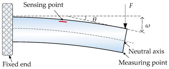 As described in Figure 1, the beam is bent under the action of force F at the measuring point, which can be modeled by the pure bending model in mechanical engineering [34,35]. The distance from the sensing point to the fixed end is L/2. According to material mechanics, the strain of the sensing point can be expressed by: